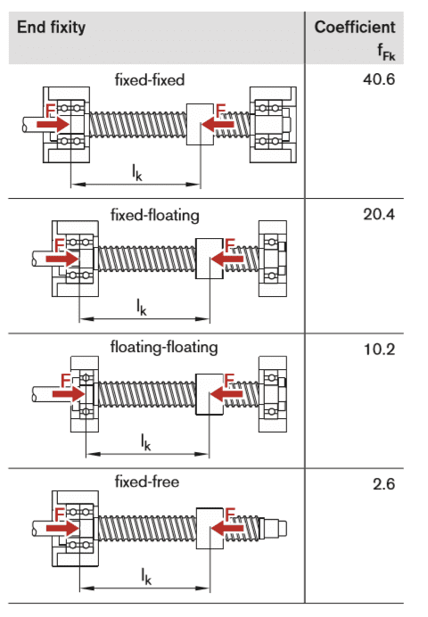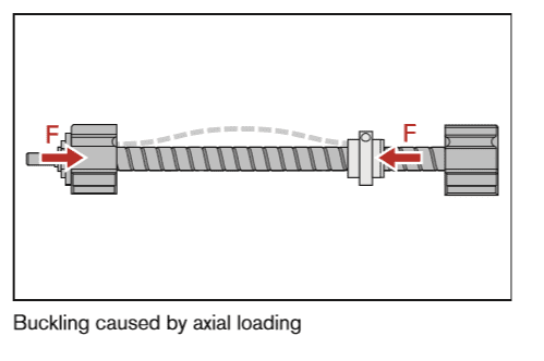 5. Calculate the permissible axial screw load (LMT Handbook Section 5.1.3.4) Axial Screw Loads are created by acceleration, friction, weight and process forces on a Ball Screw. A factor to take into account is buckling stress, this occurs when the screw shaft is exposed to a compressive force in the axial direction, which creates a bend in the screw shaft. An example of buckling can be seen below.