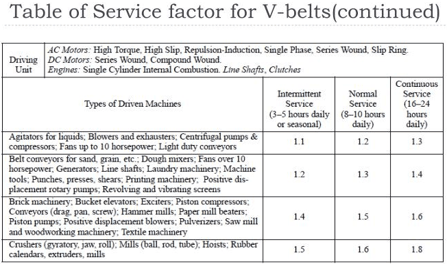 From the Table 30-5 below(Stock Drive Selection) we see that for a 5V belt the Service Factor (SF) is 1.5 for normal service operating from 6-16 hours, for Piston pump(Driven Machine Type)