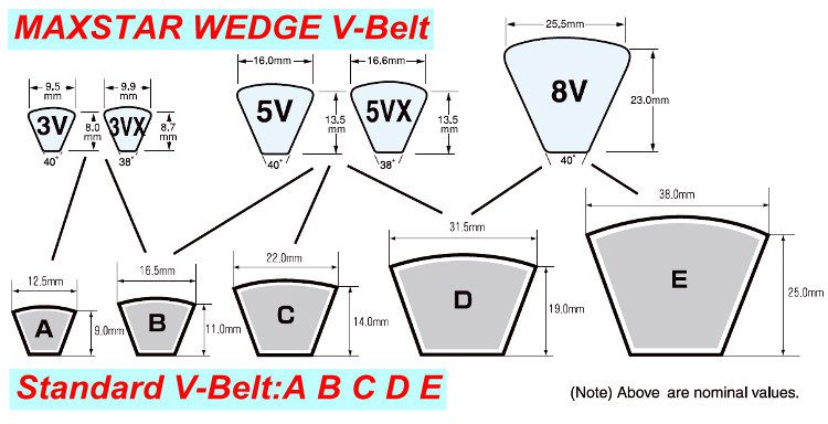 V-belts comes in five sizes identified by a letter from A to E.
