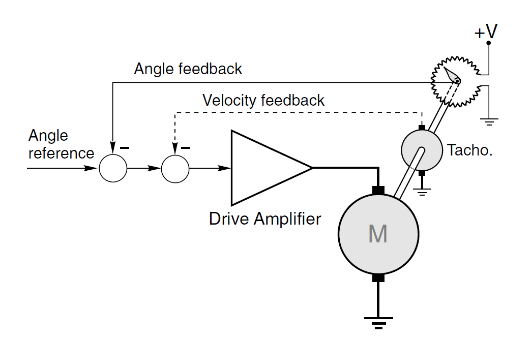 As mentioned earlier many servo motors are used in closed-loop position control applications, so it is appropriate to look briefly at how this is achieved. In the example shown in figure, the angular position of the output shaft is intended to follow the reference voltage (uref), but it should be clear that if the motor drives a toothed belt linear outputs can also be obtained. The potentiometer mounted on the output shaft provides a feedback voltage proportional to the actual position of the output shaft. The voltage from this potentiometer must be a linear function of angle, and must not vary with temperature, otherwise the accuracy of the system will be in doubt. The feedback voltage (representing the actual angle of the shaft) is subtracted from the reference voltage (representing the desired position) and the resulting position error signal is amplified and used to drive the motor so as to rotate the output shaft in the desired direction. When the output shaft reaches the target position, the position error becomes zero, no voltage is applied to the motor, and the output shaft remains at rest. Any attempt to physically move the output shaft from its target position immediately creates a position error and a restoring torque is applied by the motor.
