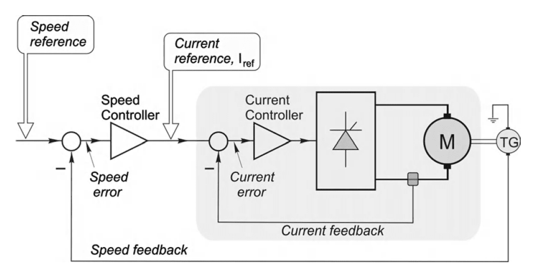 A standard DC drive system with speed and current control is shown. The primary purpose of the control system is to provide speed control, so the ‘input’ to the system is the speed reference signal on the left, and the output is the speed of the motor (as measured by a tachogenerator) on the right. As with any closed-loop system, the overall performance is heavily dependent on the quality of the feedback signal, in this case the speed-proportional voltage provided by the tachogenerator. It is therefore important to ensure that the tacho is of high quality (so that, for example, its output voltage does not vary with ambient temperature, and is ripple-free) and as a result the cost of the tacho often represents a significant fraction of the total cost.