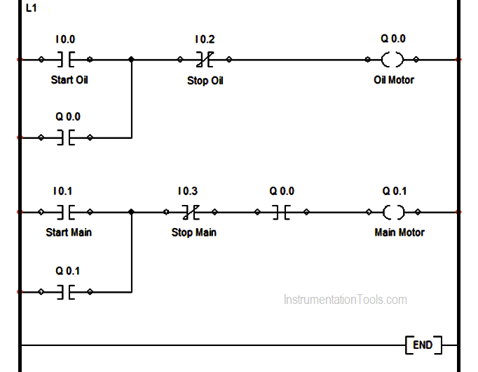 I/O controllers often make use of programmable logic controllers (PLCs). PLCs utilize ladder logic programming to simulate a physical system that would take inputs and run them through entire arrays of contacts, coils, timers, and counters to deliver an output to the rest of the system. As seen in the example of PLC ladder logic below, even something as simple as a single mechanical button press can kickstart an entire array of machines if the proper I/O device is used to distribute inputs correctly.