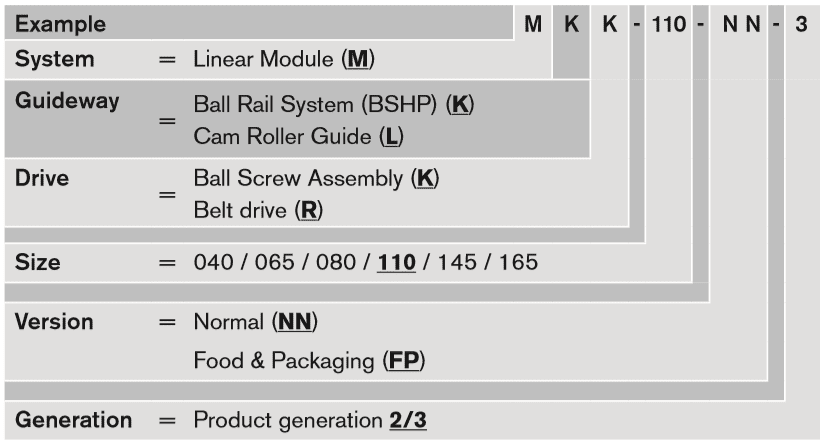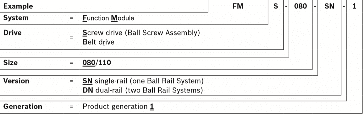 Note: For Function Modules: Ball Screw Drive are indicated as S and for other modules it is indicated as K. Belt drives are indicated as B while for other modules, belt drives are indicated as R.