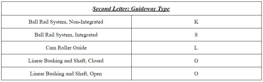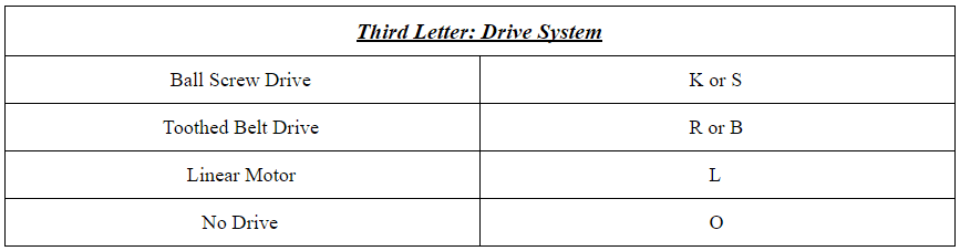 The abbreviations used for the linear motion system is a three letter acronym that details the system type, the guideway, and the drive system. The acronym has the following form: