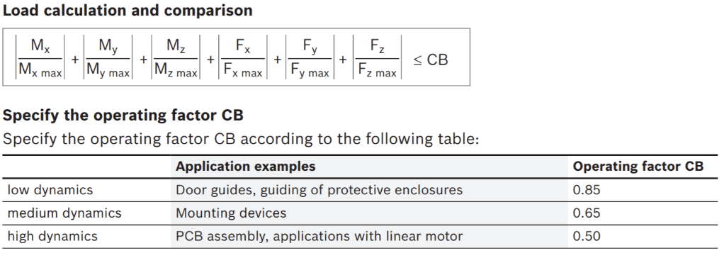 Image created by BOSCH_TOOL Most linear motion systems have a maximum load capacity that it can support without too much deformation. When looking for a linear motion system, one should look for one with a load capacity greater than the maximum load. In most situations, one should calculate a factor of safety for the linear motion system and choose a linear motion system with a factor of safety of between 2 to 6. The linear modules are often not fully supported, but installed as unsupported structured. The system can be left unsupported or be supported at several points. In the unsupported configuration, the deflection must be taken into account in order to maintain the accuracy of the system. The Bosch manuals provide the user with charts in order that has the maximum load a system can handle before the frame deflects beyond a certain value. Key Questions to Ask: