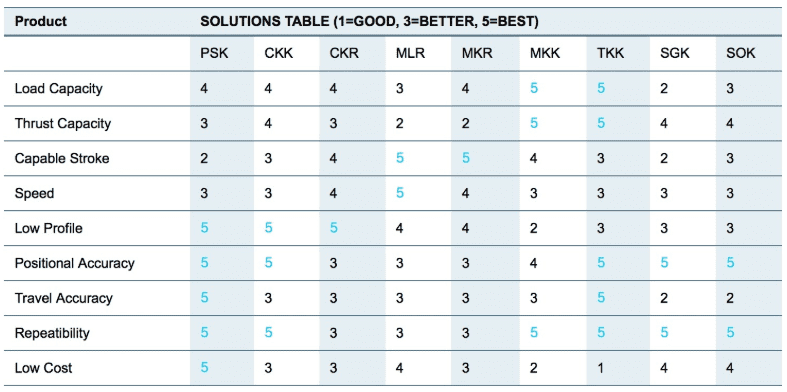 Choosing a Linear Motion System – Guideway The guideway is one of the most important decisions in selecting a linear motion system, as the guideway needs to both support the weight of the load and move the load to the correct positions. The three types of guideways for linear motion systems are the ball rail system, the cam roller guide and the linear bushing The ball rail system has higher rigidity and precision than the other two types and also comes standard with a preload. The maximum speed that it can travel is up to 5 m/s. The cam roller guide has low noise levels and higher speeds, able to reach speeds of up to 10 m/s. The linear bushings and shaft run smoother than the other two types. They are also not as sensitive to dirt or dust than the other two and are particularly robust. Besides the type of guideway, the number of guideways also determine the system, as it can affect the overall rigidity of the system. The number of guideways and carriages also effects the load capacities and moments of a linear motion system, as a system with more than one carriage has to be designed to carry the extra weight of the second carriage as well as any potential forces upon either carriage. The life expectancy is also affected by the number of rails and carriages for a linear motion system, as more rails decrease the amount of load on each rail and thus increases the life expectancy for the module. The accuracy of a two rail system is also more accurate than a one rail system because the spacing reduces errors due to yaw, pitch, and roll. Resource: https://www.controldesign.com/ Which linear motion system is the best choice for my application? There are many factors that go into deciding which linear motion system fits best for a particular job. If the linear motion system is going to be used for a lathing process, for example, then the positional accuracy and repeatability might be of the top priority. However if the linear motion system is to be used to move product from one location to another on an assembly line, then the speed and load capacity may be better deciding factors. Which linear motion system is the fastest/strongest/most accurate/etc.? Below is a table from Bosch Rexroth showcasing some of the linear motion systems they used. This chart can be used as a gauge to determine the different situations where one type of linear motion system is better than another.