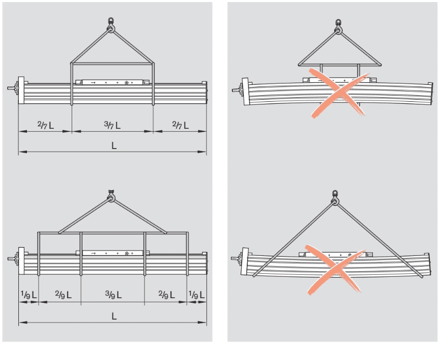 General Installation Notes Some of the longer and heavier linear motion systems have a risk of deforming the guideway when lifting them. Therefore, it is crucial that the proper lifting equipment is used and arranged in such a manner to minimize the amount of deformation of the system. The following figure demonstrates some of the correct and incorrect methods for lifting such systems.