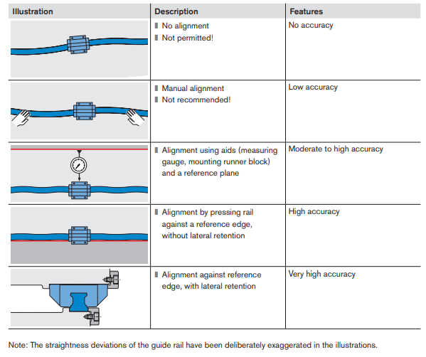 If the guide rail is precisely aligned before tightening the mounting screws, it may be possible to dispense with reference edges. The mounting requirements must be carefully considered before deciding whether and where reference edges will be needed. The product-specific mounting instructions should be consulted when planning the mounting procedure.