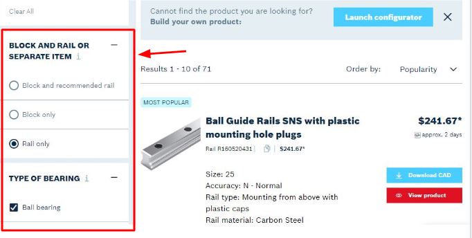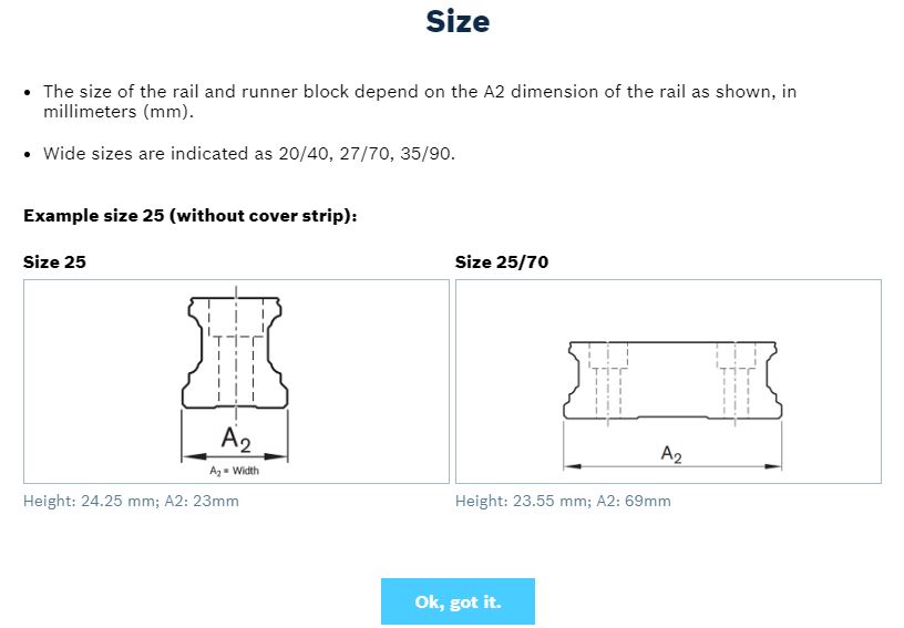 If you are unsure about the different accessories and sizes for products, you can always follow the “Linear Profiled Rail Systems Selector” link below and use the info icons. This step by step tutorial will show an alternate way to find parts.