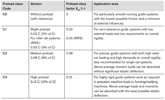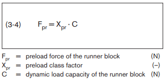 The preload force for a particular preload class can be calculated using the respective preload class factor Xpr. This internal loading of the runner block must be taken into account when calculating the life expectancy.