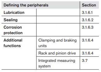 Step 7: Define the Peripherals The last step is to define the peripherals for the linear guide. This includes specifying the lubrication system and the in-service lubrication intervals. Adequate protection against life-shortening factors must be also be selected, i.e. appropriate sealing and corrosion protection. Rexroth linear guides can be equipped with additional functionalities such as clamping and braking units, rack and pinion drives, and integrated measuring systems.