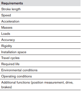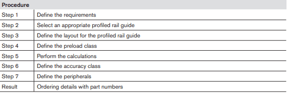 When selecting profiled rail systems, the first step is to define the requirements and operating conditions for the application, as shown below.