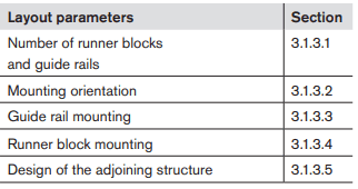 The layout for the profiled rail system now has to be defined (see section 3.1.3). Define the number of runner blocks and guide rails first. Then define the mounting orientation (horizontal, vertical, inclined, wall mounting or overhead mounting). Finally, determine how the guide rails and runner blocks are to be mounted and fastened, keeping the location and use of the reference edges in mind.
