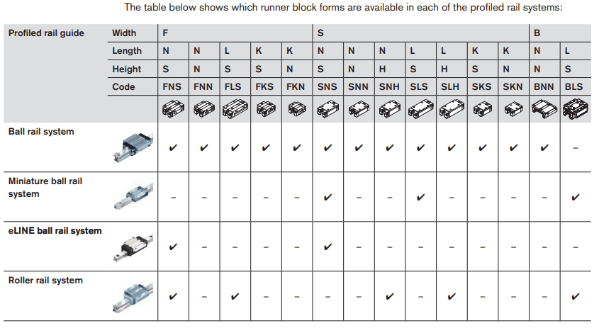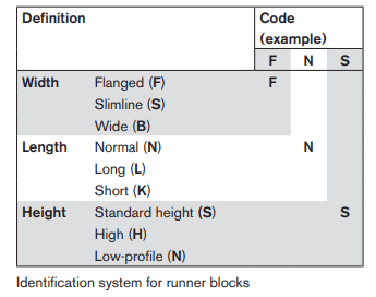 Each application makes different demands on the profiled rail systems used. There are different runner block designs to meet these different needs. The following coding system is used to identify all ball and roller runner block designs. (The code letters are based on the German product names). Cam roller guides are not covered by this system because of their special design.