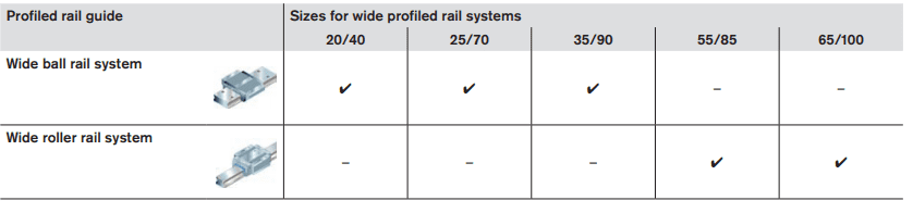 Various sizes are available, depending on the type of profiled rail system. The individual sizes have different load capacities. The tables below show the sizes offered by Bosch Rexroth.