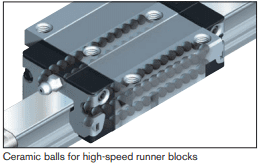 Balls- The rolling elements are balls. Normally, these are made from anti-friction bearing steel, grade 100Cr6. Stainless steel balls are used for runner blocks that will be operating in extremely hostile environments requiring corrosion-resistant elements. High-speed runner blocks have special ceramic balls. Because of their lightweight design, these balls deliver excellent dynamic performance. Ceramic balls are also good electrical insulators.
