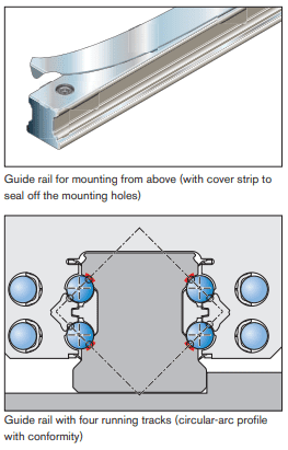 Guide rail- The guide rail is made from heat-treated steel. This steel was specially designed to meet linear motion requirements and therefore offers optimal system characteristics. The four ground running tracks have a circular-arc profile with conformity. This geometry ensures ideal running performance and can also compensate to a certain extent for misalignment. The running tracks are inductively hardened and precision-ground. Rexroth guide rails are also available in hard chrome plated (Resist CR) or in corrosion-resistant steel (Resist NR II) versions. These rails can be used in environments with aggressive media, such as dilute acids, alkalis or salt solutions. Depending on the size, one-piece rails can be delivered in lengths up to 6 m. If longer lengths are required, several rails can be fitted end to end to produce a composite rail. Guide rails can be bolted into place from above or below. V-guide rails are installed by pressing them into the mounting base.