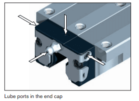 rail. Lube ports- The ball guide also contains lube ports. The lube nipples or fittings of a central lubrication system can be inserted into these lube ports. The ports are located on the end face and at both sides. This allows lubrication from any of three directions without the need for an adapter. Lubrication from the top is also possible, by opening a predrilled hole. The hole can be punched open using a heated, pointed metal tool to allow lubrication through the machine table. An O-ring seals the interface to the machine table. High-profile runner blocks require an adapter to compensate for the height difference between the end cap and the runner block body.