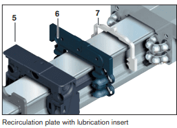 Lubrication insert- The lubrication insert (7) is made from openpored polyurethane foam. This foam soaks up the lubricant and releases it to the passing balls.The lubrication insert has been designed to allow lubrication with either oil or grease. Ball guide- The ball guide is fixed in place by the recirculation plate. The balls are redirected in the space between these two parts. The ball guide also serves to retain the balls in the load-bearing raceway of the runner block when it is not mounted on the