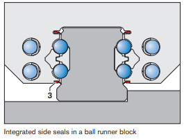 Sealing plate- The sealing plate (2) on the end face protects internal runner block components from dirt particles, shavings and liquids. It also prevents the lubricant from being dragged out. Optimized sealing lip geometry results in minimal friction. Sealing plates are available with a standard seal, low-friction seal, or a reinforced seal. Side seals- Lateral sealing strips provide additional protection, keeping dirt and shavings out of the loadbearing zones. Each runner block has four of these side seals (3).