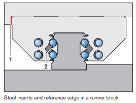can be made from heat-treated steel or anti-friction bearing steel. For special applications, especially for use in industrial robots, the body is made from aluminum. The aluminum version offers weight savings up to 60% compared to the steel version. Each runner block has a lateral reference edge (1). This edge mates with the adjoining structure. It permits precise alignment during installation and serves to transmit side loads. Steel inserts- The runner blocks have two hardened steel inserts (2) made from anti-friction bearing steel. These inserts transmit the load from the runner block body to the balls.