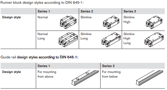 A profile rail system consists of two main parts, the runner block and a guide rail. Profiled rail guides are available in a wide variety of designs for use as machine elements. The main design styles and sizes are covered by the DIN 645 standard, which also specifies the main outside dimensions and the connection dimensions.